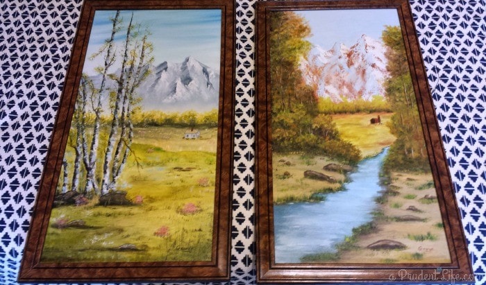 My third frame project was a duo of paintings from Granny. The frames on these were quite different from all the others we received. We had every intention of buying new frames once we found the right spot to hang them. As I was putting the guest area together, I realized they would work perfectly above each night stand.