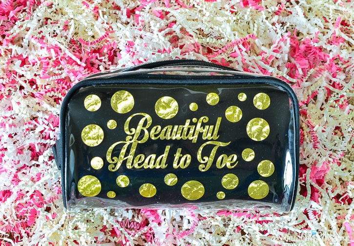 I applied the vinyl to the front of my clear pouch, but the words got lost when I added goodies to the inside. So, I had a little lightbulb moment. I used scissors to cut a piece of black vinyl to line the bag! Because the black side was facing out, you could see the back of the vinyl on the inside. I cut a piece of Ultra Silver Glitter Vinyl the same size and added it facing the inside of the bag. So, the two pieces of vinyl are back to back. See how sparkly the inside is now? Because the vinyl is not actually attached to the bag, it also means it is replaceable. When it gets all make-up-y, the liner can be tossed!