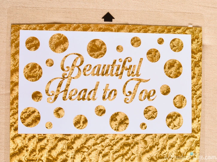 Next I checked my vinyl stash and found some black, gold, & sparkly silver left over from other projects. I used a gold leaf vinyl to cut out the words “Beautiful Head to Toe” along with polka dots using my Silhouette machine (affiliate link).