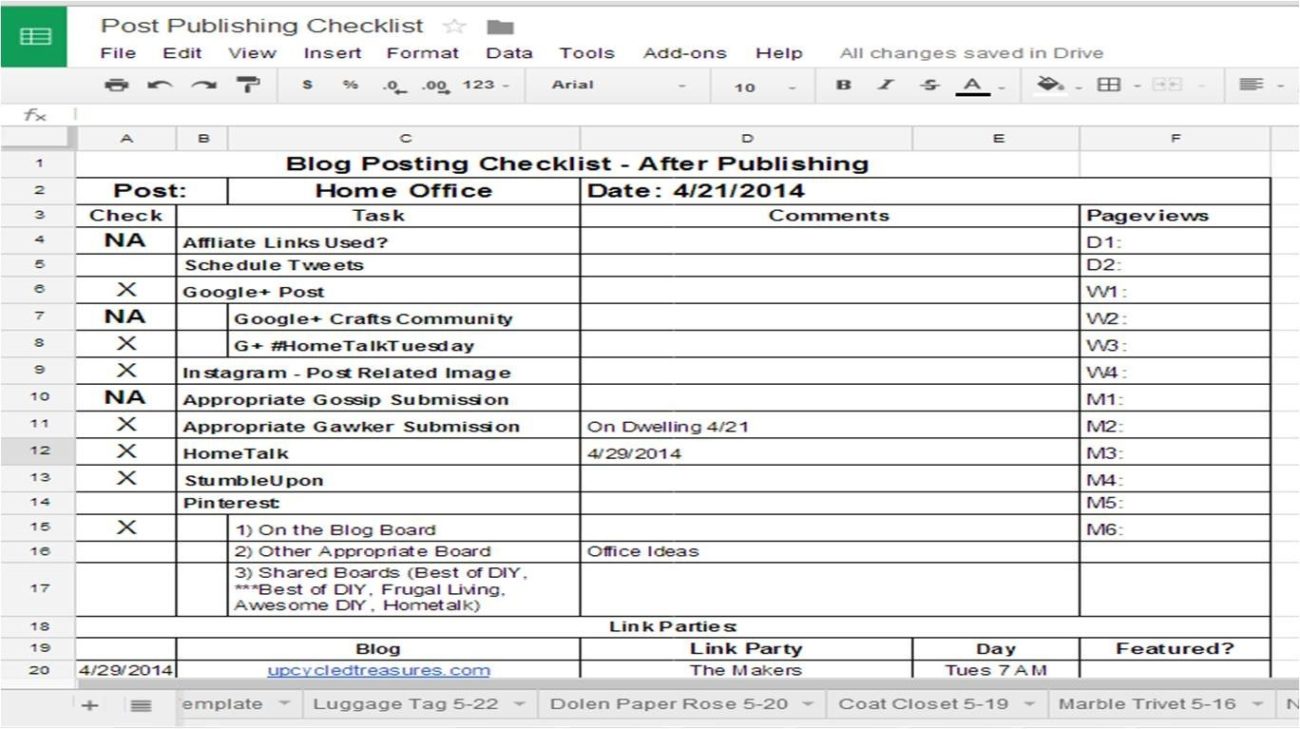 A few months ago I made a checklist in Google Docs that has been a lifesaver! Now I can keep track of which parties I’ve linked up to and which social media networks I’ve covered. Since the tracker helped me out, I decided to share it in the hope it can help someone else! I left everything customizable since we all have different networks and strategies. Also, I don’t do everything on the list for each post. It’s more of a reminder of all my options.