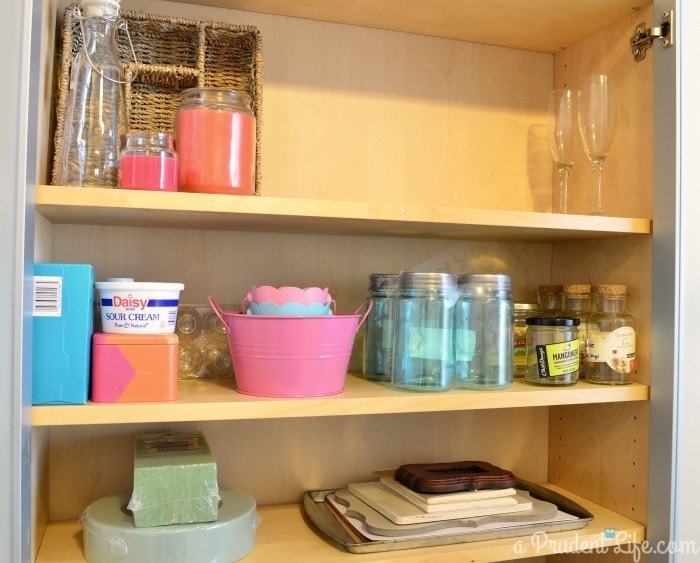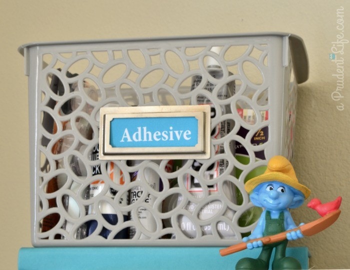 The top shelf is just as functional. I gathered all the different types of adhesives I could find from around the house into one place! Glue dots, super glue, E6000, Tacky Glue, etc. Now I can grab the entire bucket and see all my options in one place. I’m pretty sure this will help me use the right product for each project. I will totally admit that I usually use the first “close enough” product I can find.