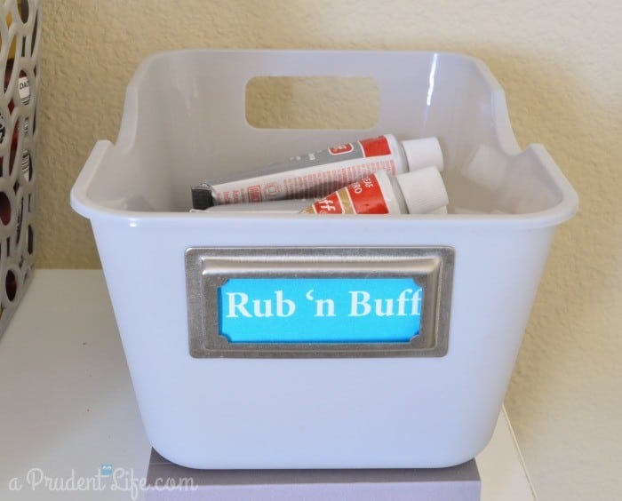 The bottom wall shelf was PERFECT for my favorite acrylic craft paints and my beloved Rub ‘n Buff collection. Each bin got a silver bookplate from Staples (Martha Stewart). The label inserts were made in PowerPoint & printed on a normal inkjet.