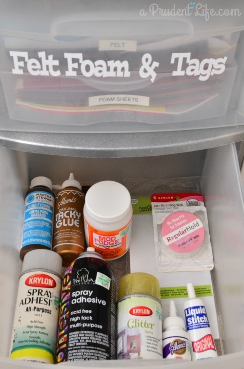 The adhesives in this drawer are duplicates of items in the adhesive bin.