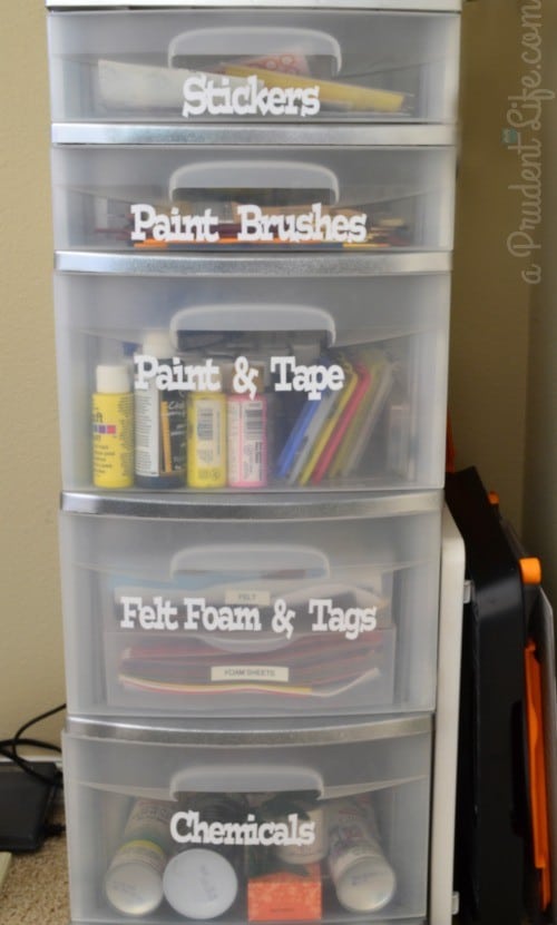 Moving over to the plastic storage drawers, I’ve got some other high priority crafting items at my finger tips. These drawers contained nothing useful before, but now they are amazing! Before I organized, I took the white plastic frame outside and gave it a coat of silver metallic spray paint. I used a plastic primer first, then a couple quick coats of silver. So far, the paint is holding up well on the plastic.