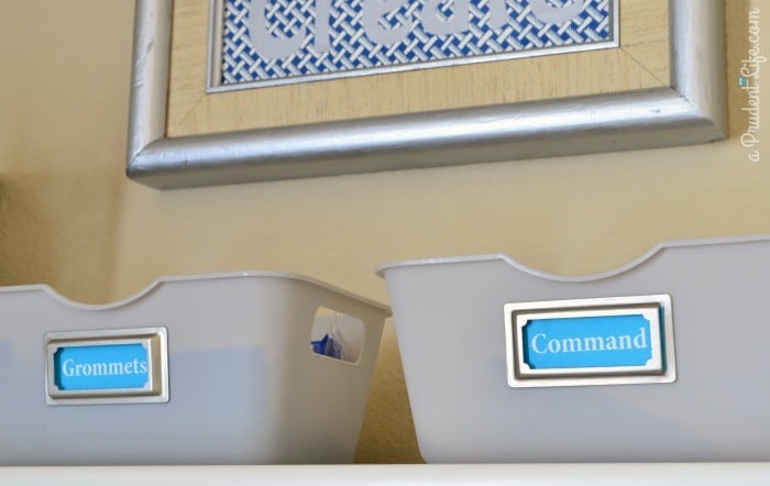 I used two more small bins up top – one for my grommet kit and one for all my Command adhesive strips. I’ve never actually USED the grommet kit, but I want to so bad. I’ve wanted one FOREVER and found it cheap at Harbor Freight one day. I know I’m weird. I gave it a key space so I would be motivated to find the perfect grommet project.