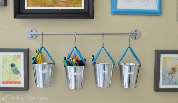 The wall also has room for pencils, pens, markers, and a roll of twine in metal buckets. I need to go through all the pens & pencils in the office and move some up to the craft room! The buckets are a little empty right now.