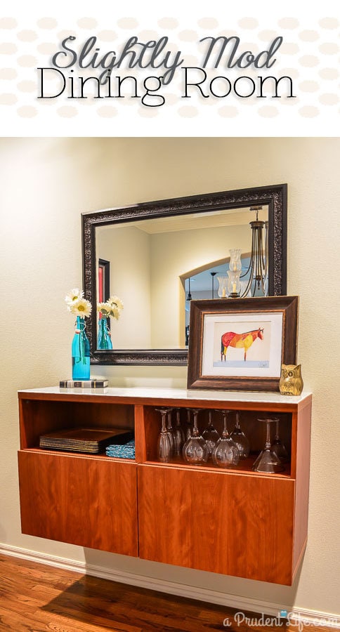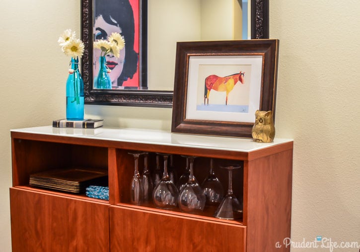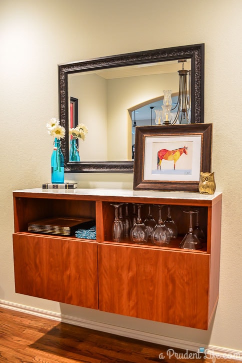 There you have it. I took my lemon of bringing the wrong cabinet home into the lemonade of doing a mini-makeover of the dining room! We choose to leave the upper shelf open instead of installing the drawer units that we bought when it was going to be an entry table, but that was the only adjustment we needed.
