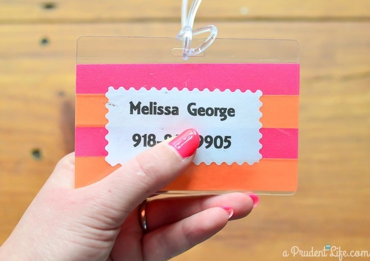 Next I printed my name and phone number and cut them out with craft scissors. I put the print out on top of the washi tape, and then removed the paper backing of the badge holder, which sealed everything together.