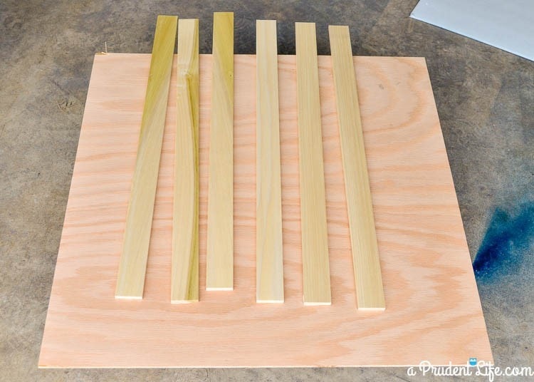 I picked up a pre-cut 24″x24″ piece of wood and several 1″ x 24″pre-cut pieces to use as the frame, along with twine & navy blue spray paint.