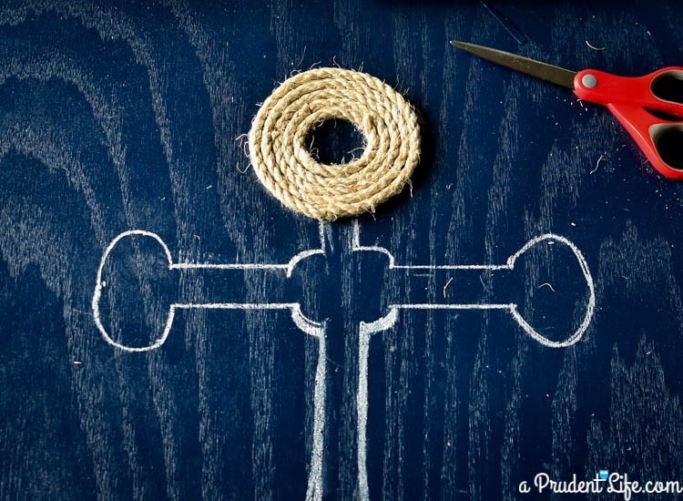 Using chalk as a templateI was pretty shocked that I was able to sketch it out so easily using my guide image. Once I had the outline done, the real fun began! I used hot glue to attach one piece of rope at a time. You’ll need some good, but inexpensive scissors to cut through the twine.