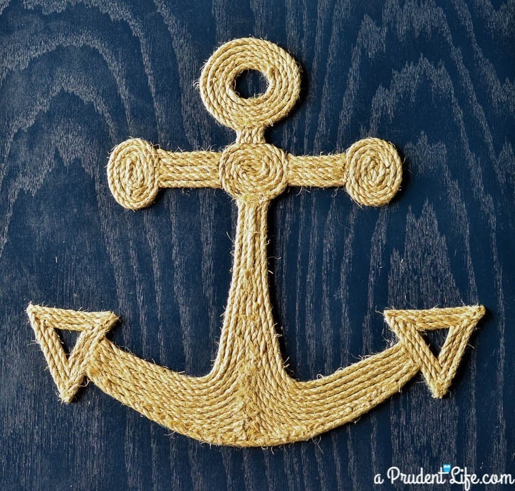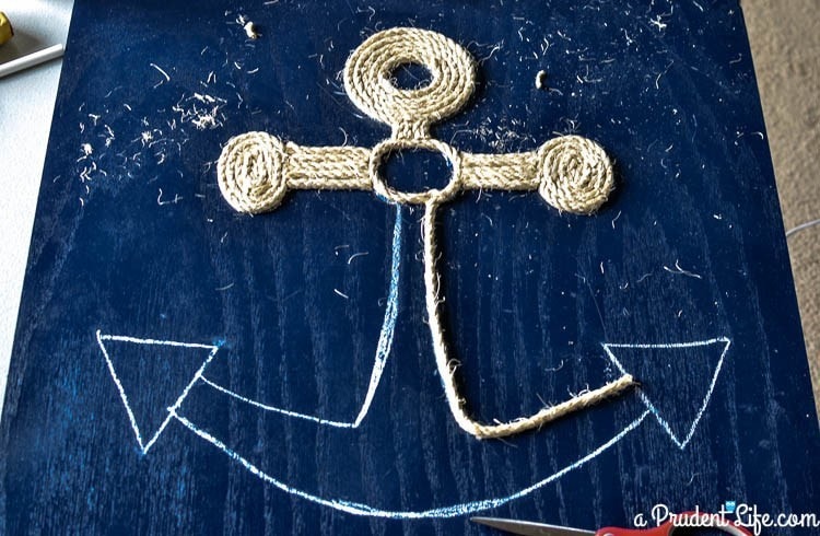 Easy anchor art from twineAs you can see in the picture below, there were some small gaps along the bottom. They were easily hidden by squirting in some hot glue and then carefully filling in the gap with an unraveled piece of twine. My twine was normally three strands thick, but I could unravel it to get a double or single piece.