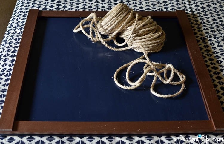 DIY Nautical Art SuppliesI was to lazy to find a yard stick, so I used my Silhouette mat as a straight edge 🙂 The pencil didn’t show up at all on the dark blue background, but chalk was an easy solution. The chalk outline doesn’t have to be perfect because it will all be covered up with rope.