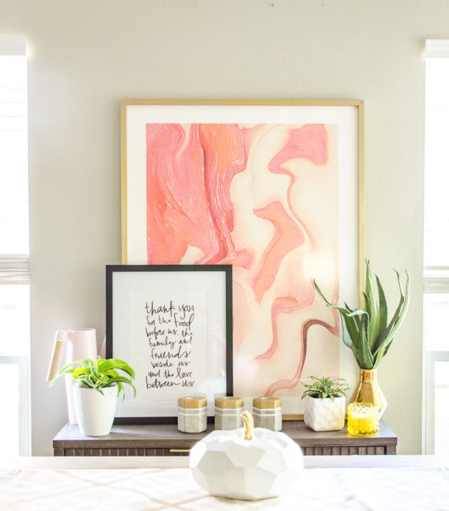This year, I kept it simple with a modern white pumpkin on the table. The black framed print is the only other new thing in this area, and it will probably stay in this spot year-round. I opted to leave the pink watering can out because I use it quite often and seeing it reminds me to water the plants. You’d think the plants would do that, but the watering can is always what triggers me.