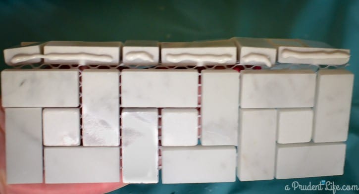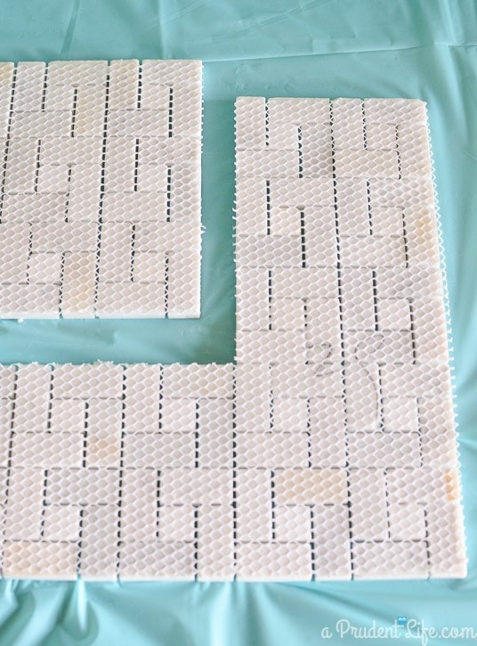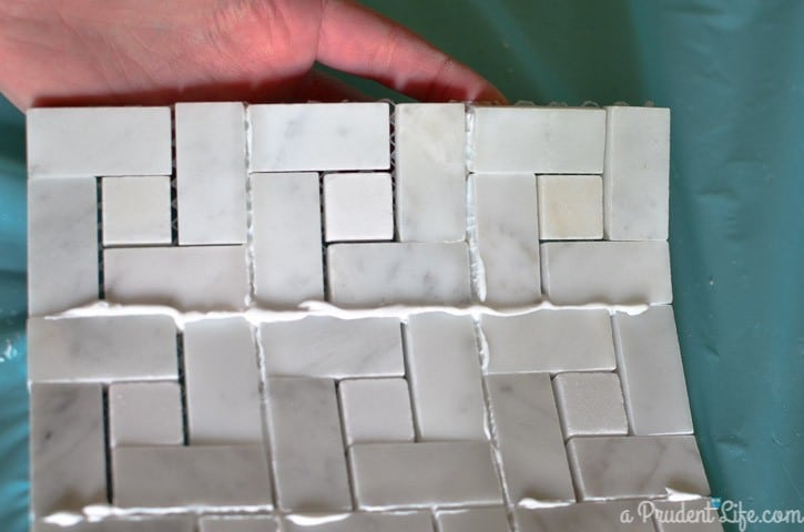 Then I bent the tiles back the other way to make sure the adhesive was touching both sides of the tile. While it was still wet, I rubbed off the excess with a damp cloth.