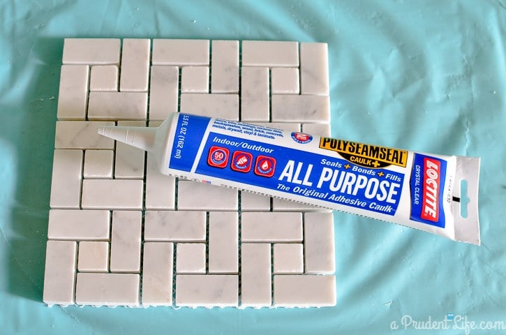 Then, instead of mixing up grout, I used a combo sealer/adhesive product to hold the tiles together. This little secret cut the hands-on time of this “project” WAY down.