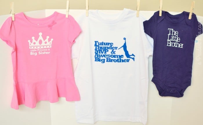 We are getting ready to welcome our newest nephew to the family! He has a great big brother & big sister already waiting for him, so I decided it would be fun to make coordinating but individualized shirts for each of them using heat transfer vinyl. I’m going to focus on my favorite design, the big sister shirt, probably because it’s the girly one, but I’ll show you all three together at the end.
