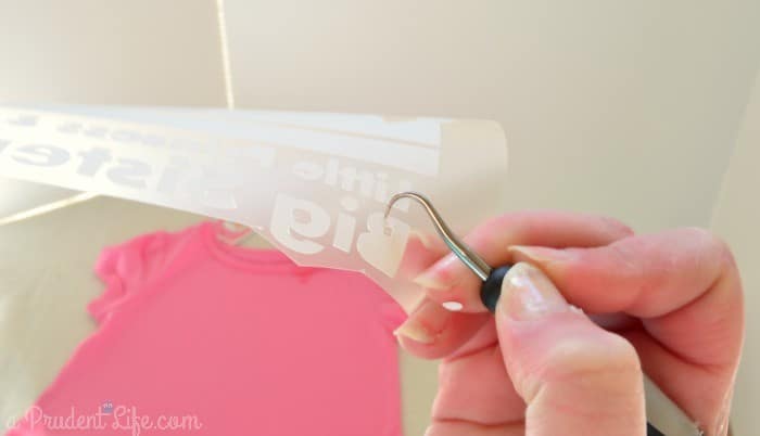 Make sure you load heat transfer vinyl with the shiny side DOWN. I forget this the first time and had to recut. Oops! Once the vinyl is cut, the negative spaces need to be weeded out.