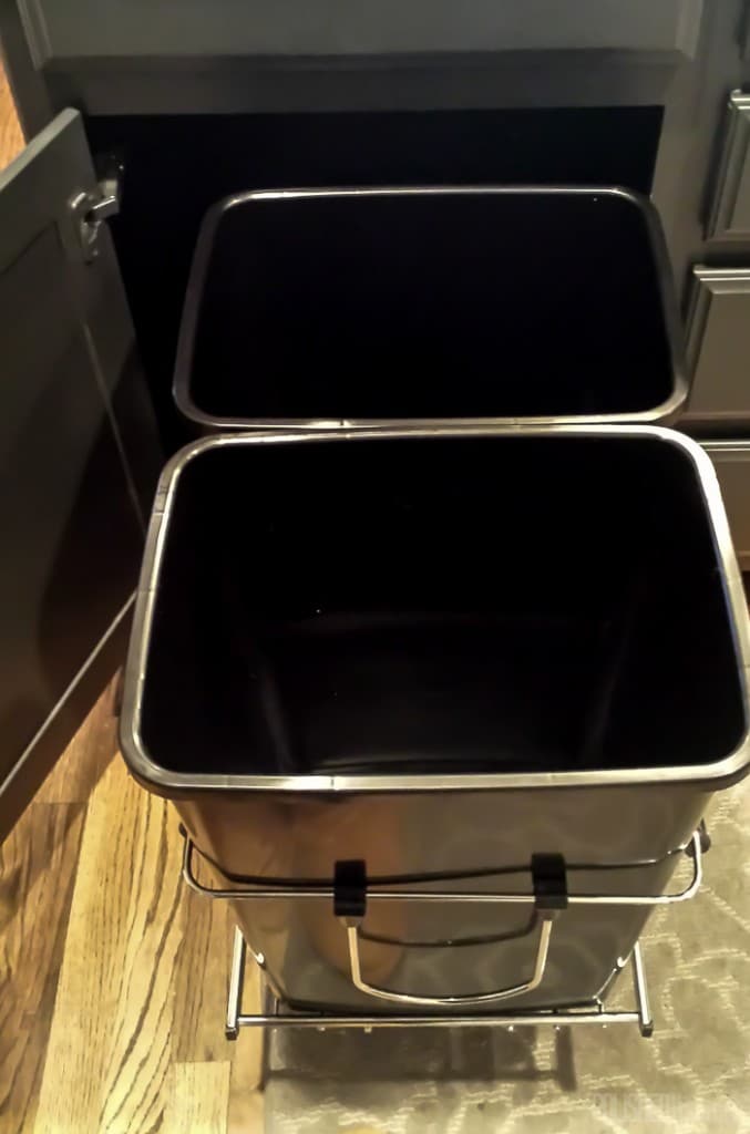 In a moment of partial frugality and partial stubbornness, we refused to pay an outrageous price for the builder to install the pull-out trash bins. I think their price was something over 4 times what it should have cost. We asked them to leave the cabinet without a shelf so we could buy and install the trash cans ourselves, but four years later we hadn’t done it. Whoops.
