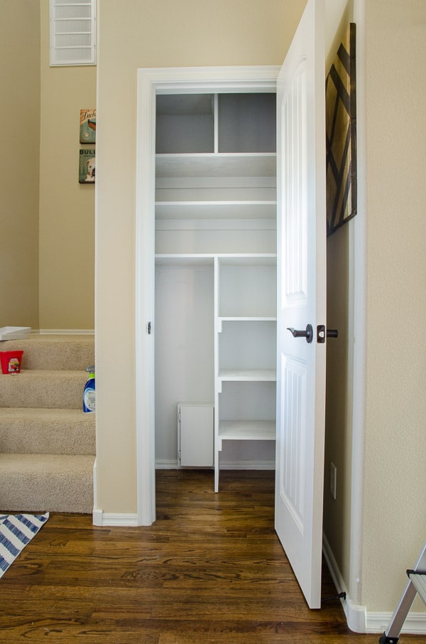 Yowsa, this makeover was probably the most physically and emotionally taxing. We aren’t afraid of a DIY project, but we are also self-taught with limited woodworking experience. So, deciding to take on a 5 week challenge to rip every shelf out of a closet and re-configure everything was insane.  And we did it in the fall, which is Corey’s busiest time at work. So some days he would work 12 hours and then come home to fight to custom build a closet. None of the walls were square, so measurements were not friendly. But in the end, I think you’ll agree it was worth it. I can’t even begin to imagine how far out of our budget this project would have been if we hired it out.