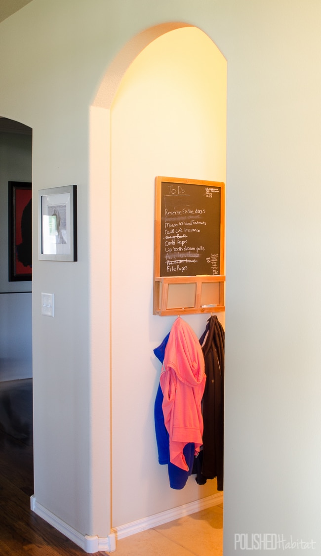 Continuing down the entry hall from the front door, we had a coat closet that I turned into a cleaning/household closet. It might have been my best decision of the year! Our coats now live in the garage entry, and the standing coat rack in the main entry is perfect for guests.