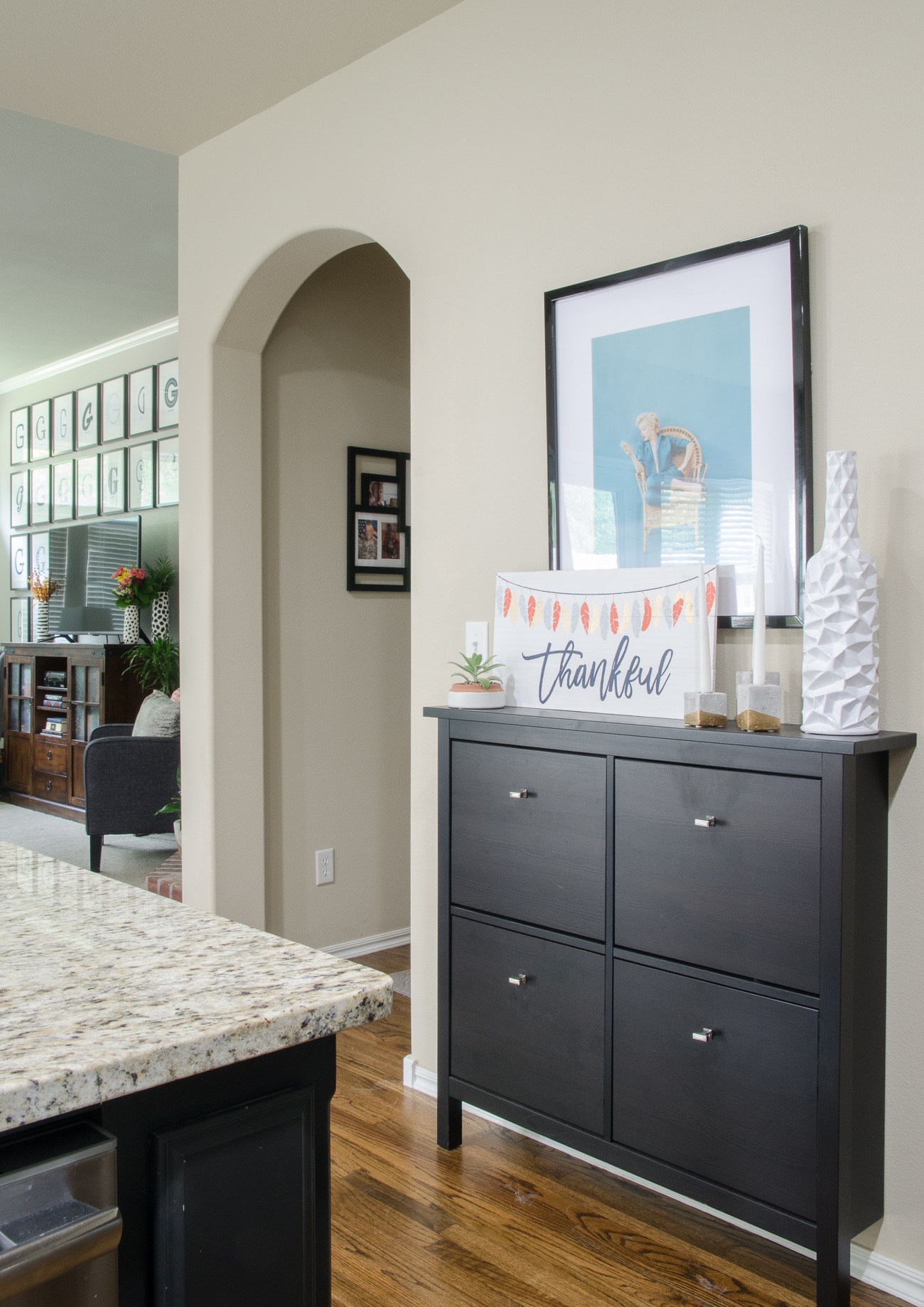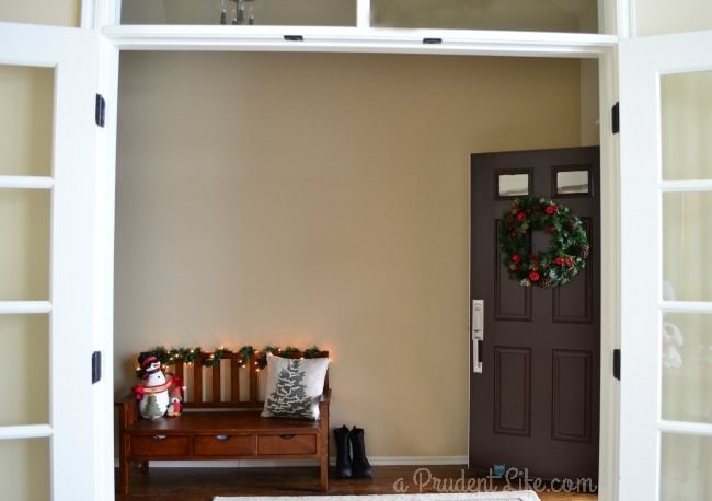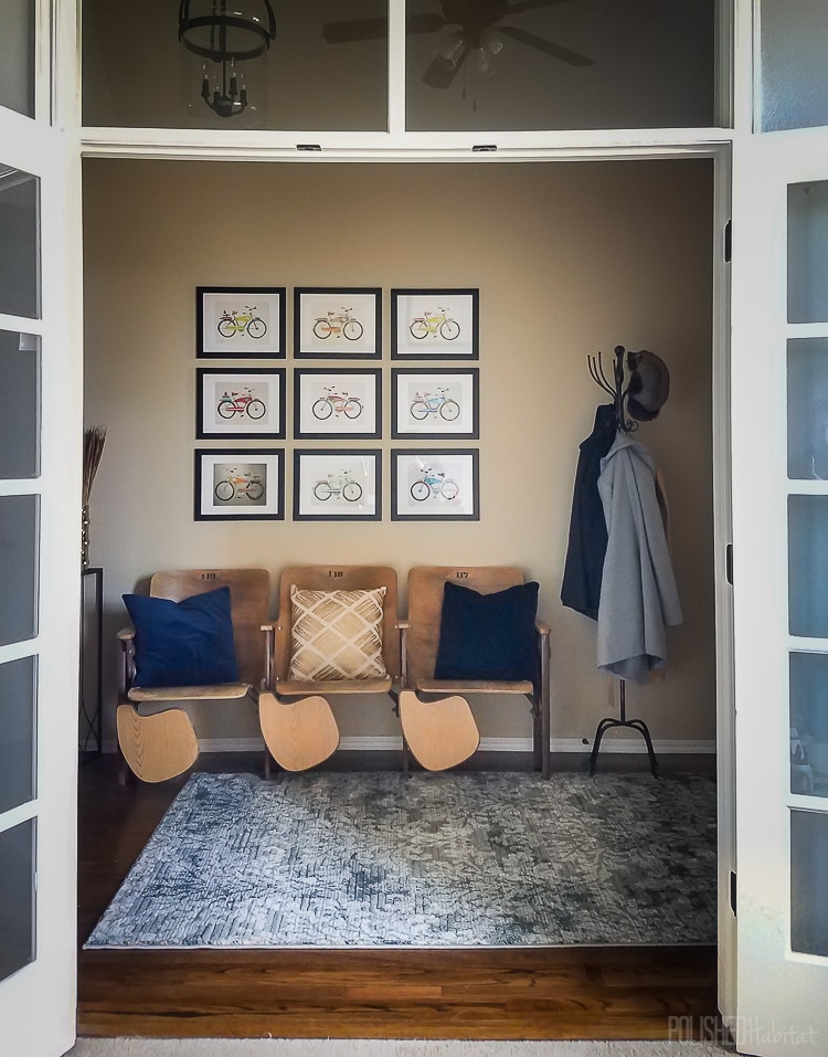 Starting at the front door, I struggled to decorate the entryway for several years, but it finally came together with inexpensive decor from At Home and a set of auditorium seats we found at a vintage sale.