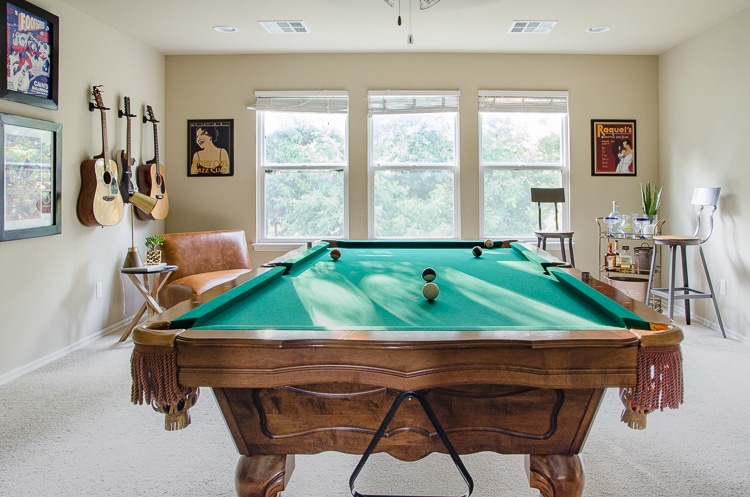 That feeling usually comes from the dining room and the upstairs, but I know we’ll get to both places. In fact, the game room finally moved a HUGE step forward this year when I surprised my husband with a pool table for his birthday. It’s not normal for us to do big gifts like that, but he’s pretty incredible and has wanted a pool table forever.