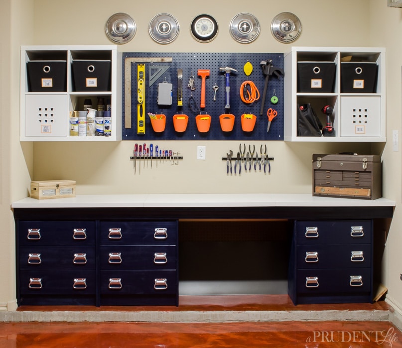 Our DIY work bench was put together with IKEA supplies to keep the price low. Using RAST dressers, LINNMON table tops, and KALLAX shelves let us customize the perfect space on a budget. Adding a pegboard creates even more storage without adding much cost.Our garage used to be a cluttered mess, but after a makeover we have plenty of room to create. Dividing the space into a workshop and "shed" was easy using $99 rolling shelving units.