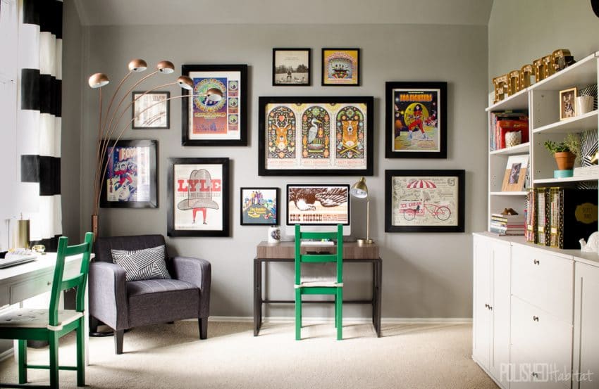 A variety of concert posters collected over the years turned into a grand gallery wall when paired with matching frames. Click for the full room tour!