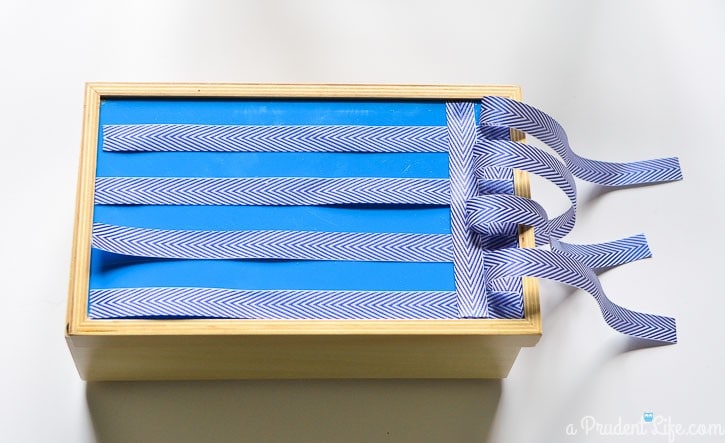 To make the box fit our decor, I decided to add a woven top using my new ribbon! Step one was cutting ribbon pieces to fit vertically & horizontally on the top. I placed all the horizontal pieces on the top and glued the end of every other piece to the top with super glue. Next I wove the first vertical piece in and out and glued it to the box as well.