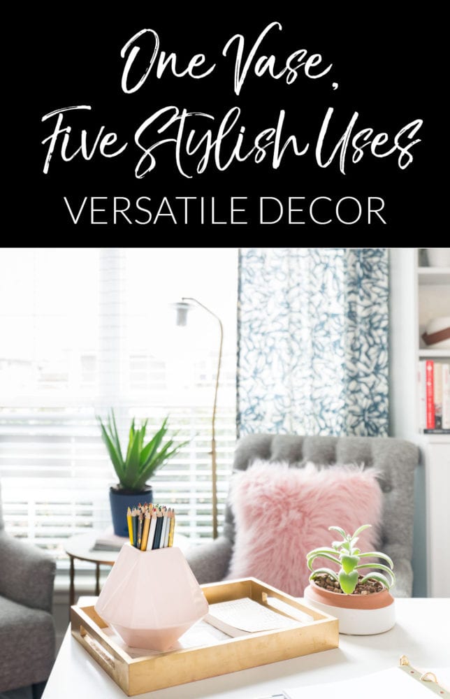 2) Faux Plants – The shape isn’t ideal as a real plant planter, but sometimes faux is the way to go. I picked up a succulent stem and dropped it into the vase for an instant impact. The oversized stem elevates the vase from a small accent to a big statement!