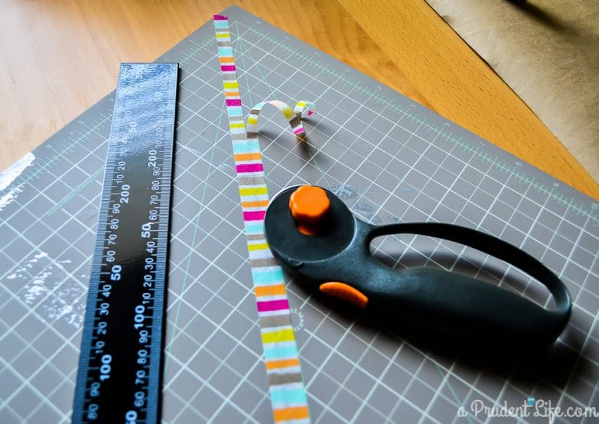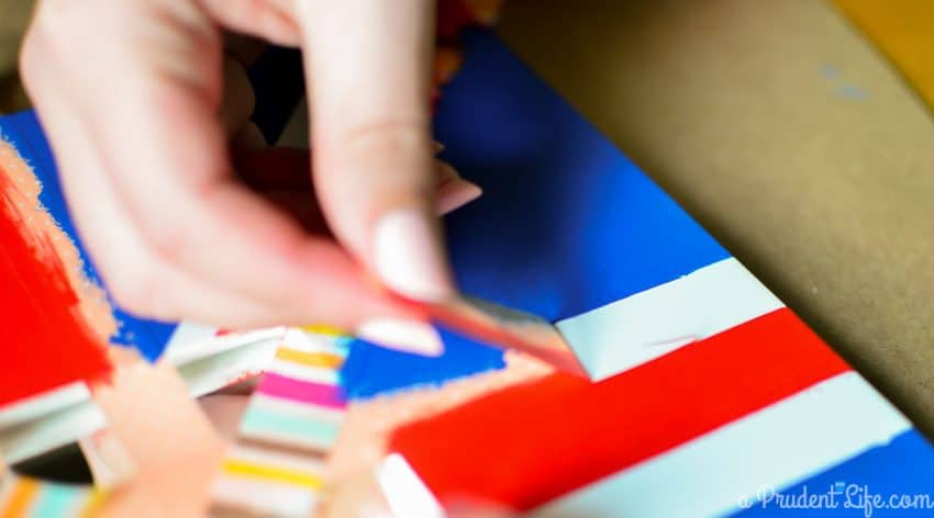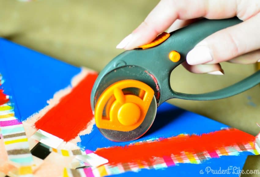 I used basic acrylic craft paint & foam brushes – nothing fancy! After I had good coverage with the paint, I let it dry. Then I ran my rotary cutter along each tape edge to break the paint seal and keep the line clean.