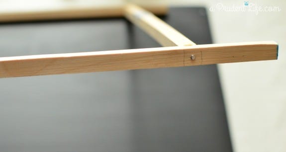 The ridges in the cake board inspired me to model the frame after an old washboard. I cut the side (vertical) dowels 2 inches longer than the board so there would be overhang.  To make the frame, I used some wood glue, then nailed the corners together with my trusty pink hammer.