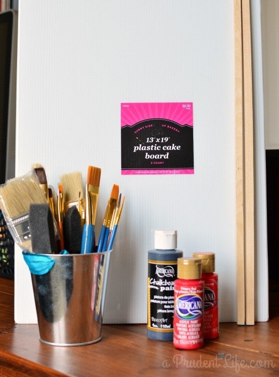 Instead of buying a canvas or using wood, I went a little experimental for my painting surface. I found a 3 pack of plastic 13 x 19 cake boards from Hobby Lobby for $5.39 (after 40% coupon). They were the perfect size for what I had in mind! At $1.80 each, I wasn’t too afraid of messing them up.  To make a frame, I bought two square 3/8″ x 36″ dowels for $1.23 each.