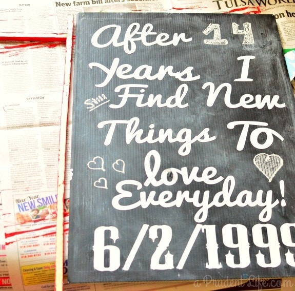 I’m a little behind the times and hadn’t had the chance to use Chalkboard Paint….until now! I came up with a great idea for a Valentine Chalkboard, and DecoArt was kind enough to provide the paint as part of their Blogger Outreach Program. I wanted to make a combo sign that used our anniversary and some other text in vinyl, but had a chalkboard look and left room to update how many years we have been married in chalk each year.